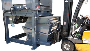 The collection container can be removed by lifting the appropriate safety device and can be downloaded from the bottom via a large tilting door operated by a lever. The door is closed automatically by lowering the container to the ground.